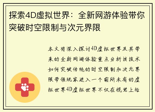 探索4D虚拟世界:全新网游体验带你突破时空限制与次元界限