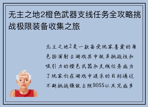 无主之地2橙色武器支线任务全攻略挑战极限装备收集之旅